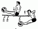 164. В положении лежа на спине на возвышении (коне) держась руками, маховая нога опущена вниз: а) партнер оттягивает ногу вниз-назад с сопротивлением первого;б) лежащий поднимает ногу вперед-вверх с упругим сопротивлением второго. Чередовать оба варианта исполнения.