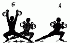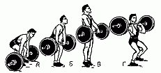 280. Подсед с разведением ног вперед-назад. Одновременно с уходом туловища под штангу одна нога, сильно согнутая в колене, выставляется вперед с опорой на всю стопу, другая отставляется назад на носок (Л), Вставать надо одновременно разгибая обе ноги (Б), затем впереди стоящая нога делает полшага назад, а другая переставляется вперед(В).Подседс глубоким приседанием на месте применяется при значительном весе штанги(Г).