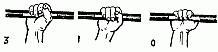 297. Существуют три способа захвата грифа штанги: в замок - 3, простой - П, односторонний - 0. В замок - наиболее крепкий, применяется, когда сила захвата имеет большое значение. При широком захвате штанги рекомендуется простой способ, а при узком - односторонний.