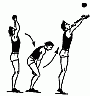 495. Бросок мяча партнеру (или в наклонный батут) из-за головы двумя руками с активным участием плечевого пояса, то же через каждое плечо одной рукой.