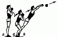 471. Ядро удерживается кистями рук снизу (А), полуприседание с замахом (Б) и быстрое выпрямление ног с броском ядра (В) вперед-вверх.