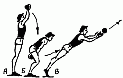 520. При толкании ядра подготовка к разбегу выполняется глубоким подседанием, затем следует энергичный мах левой ногой назад с отталкиванием правой ногой. Маховое движение заканчивается до завершения отталкивания. Это способствует выполнению скачка на опорной ноге, почти скольжением, очень быстрым ее подтягиванием и немедленным включением в активное поворотное движение с последующим выпрямлением. На основе вращательно-поступательного движения тела выполняется и разгибание туловища с мощным поворотом плечевого пояса грудью вперед-вверх. Заканчивается финальное усилие выталкиванием ядра с максимально быстрым разгибанием предплечья и хлестообразным движением кисти пальцев.