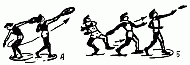 473. Стоя спиной (А), выпад правой ногой вперед (Б), быстро выпрямляя обе ноги бросить ядро через голову (В).