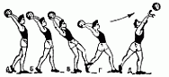 472. Стоя спиной по направлению метания (А), группировка - замах с приседанием (Б), быстрое выпрямление ног и тяга спиной с последующим броском ядра вверх назад, можно с выпрыгиванием (В).
