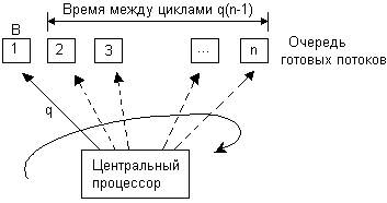 Рис. 4.6. Граф состояний потока в системе с квантованием Кванты, выделяемые потокам, могут быть одинаковыми для всех потоков или различными. Рассмотрим, например, случай, когда всем потокам предоставляются кванты одинаковой длины q (рис. 4.7). Если в системе имеется п потоков, то время, которое поток проводит в ожидании следующего кванта, можно грубо оценить как q(n-l). Чем больше потоков в системе, тем больше время ожидания, тем меньше возможности вести одновременную интерактивную работу нескольким пользователям. Но если величина кванта выбрана очень небольшой, то значение произведения q(n-l) все равно будет достаточно мало для того, чтобы пользователь не ощущал дискомфорта от присутствия в системе других пользователей. Типичное значение кванта в системах разделения времени составляет десятки миллисекунд.