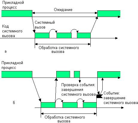 Рис. 4.15. Синхронные и асинхронные системные вызовы Выводы Система прерываний позволяет ОС реагировать на внешние события, происходящие асинхронно вычислительному процессу: сигналы готовности устройств ввода-вывода, аварийные сигналы аппаратуры вычислительной системы и т. п.