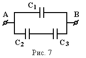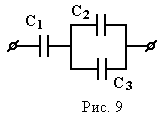 73. Два конденсатора с емкостью 4 и 1 мкФ соединены последовательно и подключены к источнику постоянного напряжения 220 В. Определить общую емкость, энергию. Как распределится напряжение между конденсаторами? 74. Три конденсатора с емкостью С1=1, С2=1, С3=2 мкФ соединены, как показано на рис. 9 и подключены к источнику постоянного напряжения 120 В. Какова общая емкость? Определить заряд и напряжение на каждом конденсаторе, общую энергию.