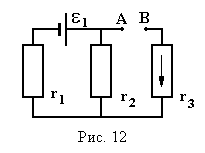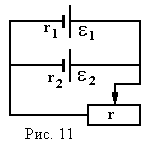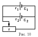 95. Две батареи /Е1=10 В, r1=1 Ом, Е2=8 В, r2=2 Ом/ и реостат /r=6 Ом/ соединены как показано на рисунке 10. Найти силу тока в батареях и реостате. 96. Два источника тока /ε1=8 В, r1=2 Ом, ε2=6 В, r2=1,5 Ом/ и реостат /r=10 Ом/ соединены, как показано на рисунке 11. Вычислить силу тока, текущего через реостат.