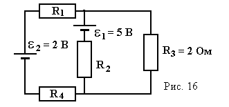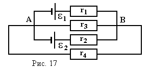 118. Элементы ε1 и ε2 включены в цепь, показано на рисунке 17. Определить силы токов, текущих в сопротивлениях r1 и r2, если e1=10 В, e2=4 В, r1=r2=2 Ом. Сопротивлением элементов пренебречь r2=r3=4 Ом.