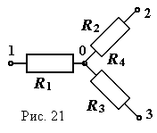 129. Каким сопротивлением должен обладать электроизмерительный прибор, чтобы его можно было использовать, либо в качестве вольтметра с пределом измерения U=15 В, либо в качестве миллиамперметра с пределом измерения I=7,5 А? 130. Определить температуру t нити лампочки, если при включении в сеть с напряжением U=220 В по нити идет ток I=0,68 А. Сопротивление вольфрамовой нити электрической лампочки при t=200С, R=36 Ом. Температурный коэффициент сопротивления вольфрама a=4,6×10-3 1/К. 131. На цоколе лампочки накаливания с вольфрамовой нитью накала написано: 120 В, 60 Вт. При изменении сопротивления этой лампочки в холодном состоянии на мостике Уитстона оказалось, что оно равно всего 20 Ом. Какова нормальная температура накала нити, если температурный коэффициент вольфрама a=5×10-3 1/К? 132. Сопротивление электролампочки 120 В, 100 Вт в накаленном состоянии больше, чем в холодном в 10 раз. Найти сопротивление в холодном состоянии и температурный коэффициент сопротивления a, если температура накала нити 20000С. 133. Какой следует взять диаметр d медного провода, чтобы падение напряжения в нем на расстоянии 1,4 км равнялось 1 В при токе 1 А? 134. Электрическая цепь состоит из трех кусков провода одинаковой длины и сделанных из одинакового материала, соединенных последовательно. Сечение всех трех кусков различно: 1, 2, 3 мм2. Разность потенциалов на концах цепи 12 В. Определить падение напряжения на каждом проводнике. 135. Каково сопротивление R отрезка медного провода диаметром 2 мм, если масса всего отрезка 8,893 кг? Удельное сопротивление меди r=0,017×10-4Ом×см и плотность D=8,93 г/см3. 136. Сопротивление R=2000 Ом состоит из двух последовательно соединенных частей. Первое сопротивление (угольное) имеет температурный коэффициент сопротивления a1=-0,01 1/К, а второе (проволочное) температурный коэффициент a2=0,02 1/К. Какой величины следует выбрать угольное и проволочное сопротивления, чтобы суммарное сопротивление цепи не зависело от температуры? 137. Определить сопротивление цепи. (См. рис. 20.) Сопротивления R1 = R2 = R3 = R5 = R6 = 1 Ом, сопротивление R4 = 8 Ом. 138. К проволочному кольцу в двух точках присоединены подводящие ток проволоки. В каком отношении делят точки присоединения длину окружности кольца, если общее сопротивление получившейся цепи в 4,5 раза меньше сопротивления проволоки, из которой сделано кольцо? 139. На сколько равных частей нужно разрезать однородный проводник сопротивлением 36 Ом, чтобы сопротивление его частей, соединенных параллельно, было R=1 Ом? 140. Как надо соединить четыре проводника, сопротивлением которых r1=1 Ом, r2=2 Ом, r3=3 Ом, r4=4 Ом, чтобы получить сопротивление R=2,5 Ом. 141. Определить проводимость электрической цепи, состоящей из двух последовательных групп параллельно включенных проводников. Провода первой группы имеют проводимость К=0,5 Ом-1 каждый, а провода второй по К=0,25 Ом-1 каждый. Первая группа состоит из четырех проводников, вторая - из двух.