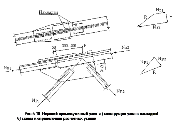В укрупнительном узле нижнего пояса усилие раскладывается на две составляющие - пера и обушка (аналогично ). На усилие рассчитывается нижняя накладка (рис.5.9) и ее швы. Боковые накладки и их швы рассчитываются на восприятие суммы усилий: и горизонтальной составляющей усилия в раскосе .