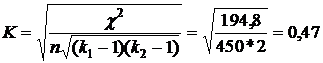 Полученное значение свидетельствует о наличии умеренной степени тесноты связи между признаками. (Поскольку при независимости признаков Коэффициент сопряженности Чупрова: