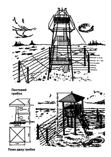 1. Територія, на якій розташовані об'єкти, що охороняються, як правило, має Територія, на якій розташовані об'єкти центрального підпорядкування, а та- Технічні засоби охорони встановлюють між внутрішньою та зовнішньою ого- Для зручності спостереження за підступами до об'єкта, що охороняється, у Висота спостережної вишки має забезпечувати чатовому огляд території по- На підходах до території з об'єктами, що охороняються, де немає огорожі, 2. Навколо об'єктів, розташованих поза територією військової частини, у разі Межі забороненої зони мають бути позначені покажчиками з написом "Забо- 3. На території поста залежно від місцевих умов чатовому має бути забезпе- Чатовому мають бути створені всі умови для несення служби на посту безпе- На території об'єктів, що мають кілька постів, межі кожного поста позначають 4. Для оборони найважливіших постів і вартових приміщень копаються та об- 5. У нічний час підступи до поста і об'єкта, що охороняється, освітлюють. територією поста, перебував увесь час у затінку. 6. Пост обладнують засобами зв'язку, які забезпечують чатовому (не менш як 7. Внутрішні пости, а також пост біля Бойового Прапора огороджують ґрата- 8. На кожному зовнішньому (а в необхідних випадках І на внутрішньому) по- пожежогасіння: вогнегасники, ящики з піском, бочки з водою, відра та інвен- 9. На зовнішньому посту має бути постовий грибок для зберігання постового Спостережна вишка (Зображення має графічний характер. Не наводиться.) Примітка. Приблизне обладнання спостережних вишок.