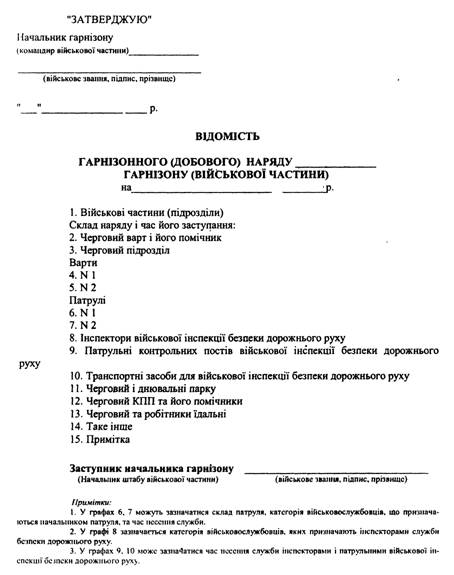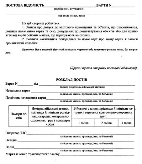 1. У графі 8 зазначають, хто призначений начальником варти: офіцер, прапорщик, сержант, старшина. 2. Розклад гарнізонних варт складає заступник начальника гарнізону, а внутрішніх - начальник штабу військової частини на підставі вказівок начальника гарнізону (командира військової частини) щодо організації охорони та оборони об'єктів з урахуванням їх можливості, огородження, забезпечення технічними засобами охорони й умовами розміщення на місцевості. 3. Розклад варт для охорони об'єктів центрального, оперативного підпорядкування, які мають свої підрозділи охорони, складає начальник військового об'єкта (складу, бази), а затверджують їх безпосередні начальники.