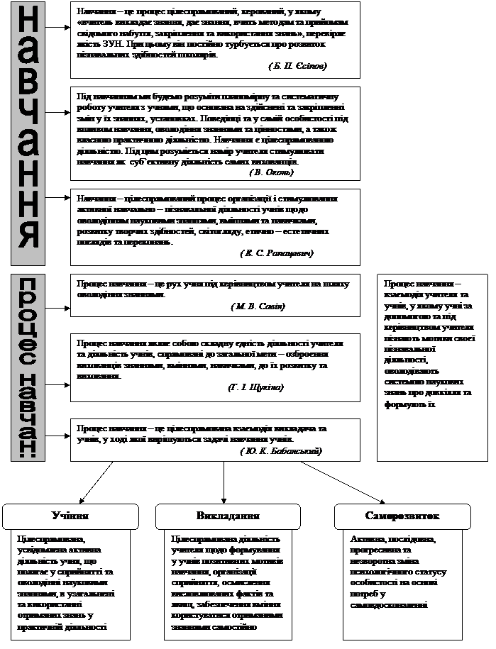 Висновок Визначальними умовами навчання як діяльності є мета освіти і завдання (навчальні, виховні, розвиваючі) навчальної діяльності, потреби і мотиви навчально-пізнавальної діяльності школярів, зміст матеріалу, який підлягає засвоєнню учнями. Ці умови взаємопов'язані й взаємозалежні. Цілі навчання визначають його зміст. Потреби і мотиви навчальної діяльності суттєво впливають на активність учнів, їх ставлення до навчальної праці і зрештою на результати навчання. У свою чергу мотиви формуються в процесі навчання, залежать від його організації, методів і прийомів навчання, засобів і змісту навчального матеріалу. Цілі навчання зумовлюють також характер діяльності вчителя й учнів, форму, методи, засоби навчання. Результат навчання залежить від результату взаємодії всіх складових компонентів процесу. Усе це свідчить про те, що процес навчання є складною цілісною системою. Найважливішими його структурними компонентами є: цільовий, стимуляційно-мотиваційний, змістовий, операційно-діяльнісний, контрольно-регулювальний і оцінно-результативний. Внутрішню структуру й організацію процесу навчання ілюструє схема «Процес навчання». Осмислення даної схеми дозволяє зрозуміти суть процесу навчання і зробити такі висновки: 1. Навчання має двосторонній характер і зумовлює необхідність тісної взаємодії учителя та учнів на всіх етапах навчальної роботи, починаючи з постановки її цілі і закінчуючи оцінюванням знань. Якщо на одному з цих етапів той чи інший учень «не включається» в навчально-пізнавальну діяльність, його навчання припиняється. 2. Виділення окремих структурних компонентів процесу навчання дає чітке уявлення про те, як потрібно підходити до його організації. Ця організація містить: постановку цілей навчання, визначення завдань навчальної роботи, збудження потреби учнів в оволодінні навчальним матеріалом, чітке визначення його змісту, залучення учнів до пізнавальної діяльності з метою його осмислення, засвоєння тощо. 3. Активізація навчально-пізнавальної діяльності учнів у процесі навчання не обмежується тим, що викладаючи матеріал, учитель використовує певні методичні прийоми. Це завдання вирішується і при визначенні цілі навчання, завдань навчальної роботи, і при формуванні мотиваційної сфери учнів, і при структуруванні змісту навчальних занять та ін. 4. Компоненти процесу навчання характеризують певний етап (цикл) взаємодії педагога й учнів. Схема показує зміну процесу в часі, його постійний рух, розвиток, тобто динамізм. 5. Процес навчання в сучасних умовах є безперервним, таким, що вказує на єдність усіх ступенів навчання, наступність етапів навчальної роботи. Саме тому його називають перманентним. Сучасна дидактика застерігає, що завданнями навчального процесу не є лише формування знань, умінь і навичок. Навчання має комплексний вплив на особистість. 6. Видача завдання для самостійної роботи Опрацювати питання «Формування і розвиток позитивних мотивів учіння школярів» за інструкцією. 7. Домашнє завдання: Знати тему, підготуватися до лабораторного заняття.