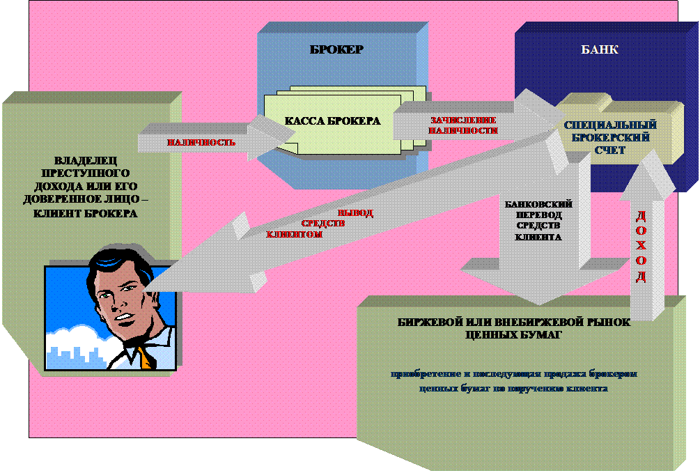 Владелец преступного дохода или его доверенное лицо (посредник) становится клиентом брокера. Средства в наличной форме (сумма, как правило, не превышает установленного Законом порога) принимаются в кассу брокера и обезналичиваются путем их сдачи в банк брокера для зачисления на специальный брокерский счет. По поручению клиента брокером на биржевом рынке (реже – внебиржевом) приобретаются корпоративные (акции) или государственные ценные (облигации) бумаги. Постоянно меняющаяся конъюнктура рынка ценных бумаг является хорошим объяснением неоднократного повторения операции по передаче брокеру наличных денежных средств для приобретения дополнительных пакетов ценных бумаг на имя клиента. Причем у брокера не должна вызывать подозрений постоянная работа клиента с наличными, поскольку у последнего всегда есть этому объяснение. За перевод средств с банковского счета на специальный брокерский счет банк берет комиссию, составляющую 3% от суммы банковского перевода, тогда как снятие клиентом банка наличности со своего счета происходит бескомиссионно. За время работы с брокером клиент дает периодические поручения на продажу принадлежащих ему ценных бумаг и вывод принадлежащих ему денежных средств в виде дохода от операций с ценными бумагами либо наличными, либо на указанный клиентом банковский счет. Характерными признаками легализации в этой схеме являются: непродолжительный период (два-четыре месяца) от момента передачи наличных денежных средств брокеру до вывода их клиентом в полном объеме и отсутствие у клиента интереса к получению максимально возможной выгоды (прибыли) от операций с ценными бумагами.