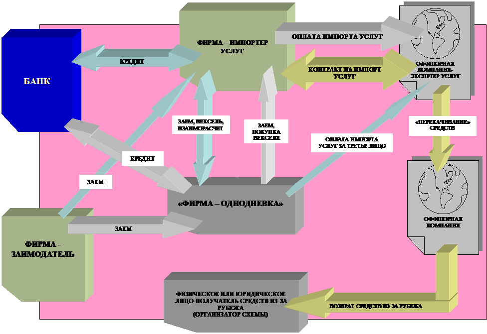 ВЫВОДА ЗА РУБЕЖ ПО КАНАЛУ ИМПОРТА УСЛУГ Легализация - придание законного вида владению, пользованию или распоряжению денежными средствами – через механизмы импорта услуг предполагает в качестве обязательных условий: - наличие денежных средств на банковском счете импортера или иной структуры, оплачивающей импорт услуг за импортера по схеме взаиморасчетов; Наличие лжеэкспортера услуг (компании российского происхождения) за рубежом, как правило, в оффшорной юрисдикции. Размещенные на банковском счете деньги могут иметь различное происхождение: преступные средства прошедшие первый этап легализации (размещение) и поступившие на счет импортера в виде займа или средств от продажи векселя; чистые деньги – банковский кредит, заем (которые преступник намерен похитить). Банковский кредит может также выполнять функцию маскировки средств, направляемых за рубеж в оплату импорта услуг. В этом случае банковский кредит возвращается. Использование в схеме лжеимпорта услуг посредника для получения банковского кредита и организации фиктивного взаиморасчета существенно облегчает процесс отмывания и снижает опасность применения к преступнику правовых санкций. В качестве посредников выступают обычно лжепредпринимательские структуры - фирмы-однодневки, «растворяющиеся» после удачно проведенной операции.