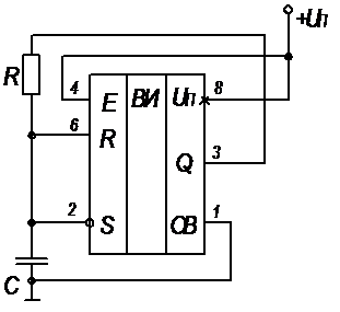 Режим работы мультивибратора. Таймер может работать в режиме мультивибратора. Простейшая схема содержит всего два дополнительных навесных элемента – конденсатор С и резистор R времязадающей цепи. Для получения автоколебательного режима работы МВ входы компараторов таймера (выводы 2 ( Эти входы (R и S) служат для контроля напряжения конденсатора С. Когда это U достигает уровня