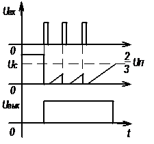 В исходном состоянии при При этом нижний по схеме компаратор K2 устанавливает T2 в единичное состояние и С1 заряжается, т.е. начинается отсчет времени. Если в этот период на вход схемы поступит еще один запускающий импульс, то С1 окажется опять разряженным, а на выходе Q сохранится единичное состояние и т.д. Схема переключится только спустя время Интервал времени следования импульсов должен быть не более