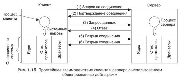 Эти примитивы могут использоваться для взаимодействия запрос-ответ в среде клиент-сервер. Чтобы проиллюстрировать, как это происходит, мы покажем набросок простого протокола, который осуществляет службу, используя общепризнанные дейтаграммы. Вначале сервер исполняет LISTEN, показывая тем самым, что он готов устанавливать входящие соединения. Этот примитив обычно реализуется в виде блокирующего системного вызова. После его исполнения процесс сервера приостанавливается до тех пор, пока не будет установлено соединение. Затем процесс клиента выполняет примитив CONNECT, устанавливая соединение с сервером. В системном вызове должно быть указано, с кем именно необходимо установить связь. Для этого может вводиться специальный параметр, содержащий адрес сервера. Далее операционная система клиента посылает равноранговой сущности пакет с запросом на соединение, как показано на рис. 1.15 стрелочкой с пометкой (1). Процесс клиента приостанавливается в ожидании ответа. Когда пакет приходит на сервер, операционная система обнаруживает запрос на соединение. Она проверяет, есть ли слушатель, и в этом случае разблокирует его. Затем процесс сервера может установить соединение с помощью ACCEPT. Он посылает ответ (2) назад к процессу клиента, чтобы принять соединение. Прибытие этого ответа освобождает клиента. Начиная с этого момента считается, что сервер и клиент установили соединение. Самым очевидным жизненным примером такого взаимодействия может служить звонок покупателя (клиента) в сервисный центр компании. Менеджер сервисного центра должен находиться у телефона, чтобы иметь возможность ответить на звонок. Клиент совершает звонок. Когда менеджер поднимает трубку, считается, что соединение установлено. Следующим шагом будет выполнение сервером примитива RECEIVE, подгота вливающего систему к принятию первого запроса. В нормальной ситуации это происходит сразу же после прекращения ожидания (LISTEN), даже до того, как клиент получает подтверждение соединения. Системный вызов RECEIVE вновь блокирует сервер.