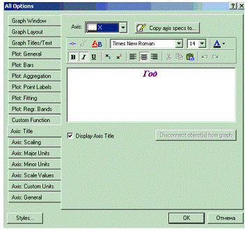 2.3.4. На вкладке «Axis Titles» ввести название оси X, цвет шрифта вишневый, остальные параметры указаны на рис. ниже. Аналогично ввести названия левой и правой оси Y.