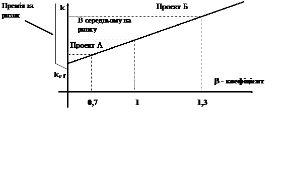 Існує також модифікація розглянутої методики, яка передбачає застосування кількісних імовірнісних оцінок. В цьому випадку методика буде мати такий вигляд: · по кожному варіанту вираховується песимістична, найбільш імовірна та оптимістична оцінка грошових надходжень та NPV; · для кожного проекту значенням NPVp, NPVml, NPVo присвоюється імовірність їх здійснення; · для кожного проекту вираховується імовірне значення NPV, зважене по присвоєним імовірностям, та середнє квадратичне відхилення від нього; · проект з більшим значенням середнього квадратичного відхилення вважається більш ризиковим. Інша модель передбачає поправку на ризик для коефіцієнту дисконтування. Відомо, що для більшості інвестиційних проектів, які передбачають класичну систему інвестування, ріст коефіцієнту дисконтування веде за собою зменшення приведеної вартості і, відповідно, NPV. Логіка такої методики може бути представлена таким чином (рис. 4.3.).
