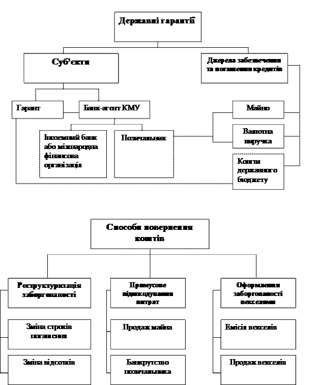 Державні гарантії та умови їх надання (матеріал для виконання самостійної роботи) В умовах переходу до ринкової економіки особлива роль в процесі кредитування підприємств і установ належить державним гарантіям. Гарантія надається з метою забезпечення кредиторів надійністю повернення кредитів. В ситуації, коли позичальник неспроможний виконати передбачені платежі, гарант зобов'язаний провести необхідні розрахунки за власні кошти. У разі, коли гарантом виступає держава, кредитування підприємств і установ значно розширюється. Державна гарантія- це зобов'язання держави (в особі уряду) повністю або частково виконати платежі на користь кредитора у випадку невиконання позичальником зобов'язань за одержаними позиками. Надання державних гарантій за кредитами суттєво зменшує кредитний ризик, що супроводжується зниженням процентних ставок за кредитами. Та з іншого боку, механізм надання державних гарантій повинен бути зваженим, оскільки неповернення позичальником позик приводе до використання коштів державного бюджету. Формою надання державних гарантій є поручительство- це зобов'язання виконати передбачені платежі в разі невиконання їх позичальником (частково або в повному обсязі). Надані державою гарантії можуть бути внутрішніми та ювнішніми. Внутрішні гарантії- це гарантії уряду перед резидентами країни. Зовнішні- перед нерезидентами. У разі невиконання боржниками своїх кредитних зобов'язань гарантія уряду, по суті перетворюється в дотацію підприємству. А в умовах наявності гарантій нерезидентам - такі дотації надаються в ВКВ, що є фактором зростання державного зовнішнього боргу. До того ж, внаслідок наявності бюрократичного механізму надання державних гарантій, далеко не завжди вони використовуються з метою фінансування найбільш ефективних проектів. Прийняття рішення про надання державних гарантій в Україні передбачає проведення експертизи проектів. Вона здійснюється Кабінетом Міністрів України, зокрема, для експертної оцінки залучається Національне агентство реконструкції і розвитку; Валютно-кредитна рада, Міністерство економіки, Фонд державного майна України, Міністерство фінансів, Міністерство зовнішніх економічних зв'язків. Остаточне рішення про надання державних гарантій затверджується постановою Кабінету Міністрів України. З метою забезпечення виконання державних гарантій уряд визначає банка-агента. За розрахунками експертів з 1992 до 2000 рр. Уряд України сплатив іноземним кредиторам за боргами підприємств, біля 1 млрд. дол. Мається також заборгованість і резидентів перед державним бюджетом з гарантій за кредитами в сумі до 1 млрд. грн. Ці кошти повинні бути повернуті державі. При цьому враховуються такі зобов'язання позичальників: погашення суми заборгованості; виплата пені; оплата комісійних платежів уряду (для іноземних кредитів); сплата процентів Мінфіну за одержані позики; повернення відсотків за користування кредитами МБРР (рис. 2). Урядом прийнято декілька конкретних способів повернення коштів державного бюджету, виплачених внаслідок надання державних гарантій за кредитами. До них, зокрема, відносяться: 1.Реструктуризація заборгованості. 2.Примусове відшкодування витрат держави за гарантійними зобов'язаннями: а) стягнення заборгованості за рахунок продажу майна боржника (через арбіт