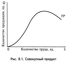 | Совокупный продукт (TP) – общий выпуск продукции, полученный при увеличении вложения одного (переменного) ресурса (труда) и неизменности других (рис. 8.1).