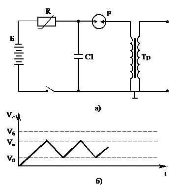 Постоянный ток низкого напряжения от первичного источника 1 поступает на преобразователь 2, дающий на выходе переменный ток. Импульс переменного тока, поданный на первичную обмотку индукционной катушки 3 возбуждает в ней затухающие электромагнитные колебания, амплитуда и частота которых зависит от емкости контура преобразователя тока и индуктивности обмотки. Контур преобразователя тока и первичной обмотки настраивается в резонанс с высоковольтным контуром вторичной обмотки. Благодаря этому, во вторичной обмотке индуктируются электромагнитные колебания той же частоты, но высокого напряжения. Повышение напряжения осуществляется за счет коэффициента трансформации катушки и резонансного усилителя напряжения. Такой способ позволяет получить коэффициент усилия по напряжению до 3000…5000, т. е. повышать напряжение с 2…4 В до 8…10 кВ. так как для питания приемников излучения необходим постоянный ток, то после индукционной катушки 3 включается выпрямитель-умножитель 4, с выхода которого и снимается постоянный ток высокого напряжения. Для устранения колебаний напряжения на режим работы преобразователя устанавливаются стабилизаторы 5. он может входить в состав отдельных блоков. Для обеспечения высоким напряжением различных номиналов в схеме предусматривается делитель напряжения 6. Ограничитель тока 7 служит для защиты приемника излучения от пробоя при сильных засветах и резком увеличении фототока. Основными характеристиками высоковольтного блока является напряжение и сила тока на выходе, потребляемая мощность и напряжение на входе. Требования к величине и стабильности этих характеристик обусловлены назначением прибора, схемами и конструктивными параметрами нагрузки блока питания. Основным элементом схемы высоковольтного блока является преобразование тока. В зависимости от его схемы и устройства высоковольтные блоки можно разделить на следующие группы: вибрационные, релаксационные, с полупроводниковым преобразователем тока. В вибрационных преобразователях преобразование постоянного тока в переменный осуществляется при помощи вибраторов, представляющих собой электромеханические прерыватели. Основными недостатками схем с вибропреобразователями является наличие контактных устройств, для работы которых требуются искрогасители, а иногда и глушители шума, повышенная мощность первичных источников, а также ограниченный срок непрерывной работы в зависимости от ресурса вибратора. В схеме релаксационного блока (рис. 2) в качестве преобразователя тока используется генератор релаксационных колебаний, обеспечивающий периодическое изменение напряжения в первичной обмотке индукционной катушки в виде пилообразных импульсов тока.