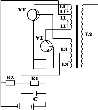 Рис. 3. Однотактный генератор Он включен в цепи обмоток L1 и L2 индукционной катушки так, что образуется контур генератора переменного тока с обработкой трансформаторной связью. При включении питания Un d цепи эмиттер-коллектор-L1 происходит нарастание тока. При этом, в L1 индуктируется напряжение такой полярности, что плюс его приложен к эмиттеру, а минус – к базе триода. В результате ток в цепи L1 достигает максимального значения и увеличение его прекращается. В этот момент напряжение на L3 начинает снижаться, что вызывает уменьшение тока на L1. Последнее является причиной возникновения в L3 напряжения обратной полярности (к базе приложен полюс L3). В результате происходит запирание триода и ток в цепи L1 становится равным нулю. Далее этот процесс многократно повторяется. Таким образом, через первичную обмотку трансформатора протекают импульсы тока. Режим прерывистой генерации создается включением емкости С в цепь базы триода. При каждом импульсе происходит заряд С от 3 в первый полупериод, когда к эмиттеру приложен плюс напряжения обратной связи. Во второй полупериод происходит незначительный разряд С, так как напряжение от L3 приложено в непроводящем направлении база-эмиттер. Серия импульсов заряжает С до напряжения Uc, при котором происходит запирание триода, так как плюс приложен к базе. В результате происходит срыв генерации, наступает пауза, в течение которой емкость С разряжается через R2 источник питания и L3. затем генерируется следующий пакет импульсов. По сравнению с рассмотренными выше однотактными схемами двухтактные имеют большой КПД, позволяют преобразовывать большую мощность и лучше использовать трансформатор. В двухтактной схеме (рис. 5) используются два триода ПП1 и ПП2. первичная обмотка трансформатора (L1′ и L1″) и обмотка обратной связи (L3′ и L3″) состоят из двух секций каждая. Напряжение смещения снимается с резистора R1 делителя R1-R2 и приложено плюсом к эмиттерам, а минусом – к базам. При включении питания Un через оба периода по цепям эмиттер-коллектор – соответствующая секция первичной обмотки трансформатора начинают протекать точки i1′ и i1″. Эти токи создают в сердечнике трансформатора магнитные потоки обратных направлений. Вследствие неидентичности параметров триодов величины токов i1′ и i1″, а следственно и магнитных потоков в сердечнике трансформатора неодинаковы.