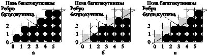 Рис. 4.7. Усунення східчастості ребра багатокутника: (а) без усунення східчастості, (б) інтенсивність пропорційна площі частини пікселя, яка знаходиться всередині багатокутника, (в) ребро, отримане за допомогою модифікованого алгоритму Брезенхема. При наявності декількох інтенсивностей, тобто півтонів сірого або відтінків кольору, зовнішній вигляд ребра або відрізка може бути поліпшений розмиванням країв. Простий евристичний метод полягає в тому, щоб встановлювати інтенсивність пікселя на ребрі пропорційною площі частини пікселя, яка знаходиться всередині багатокутника. Ця проста форма усунення східчастості ілюструється рис. 4.7, на якому зображене одне ребро багатокутника з тангенсом кута нахилу