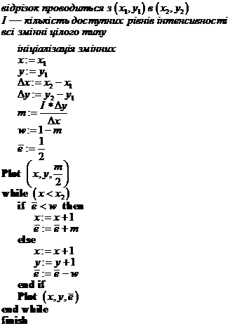 Рис. 4.9. Алгоритм Брезенхема з усуненням східчастості Інтенсивність для першого пікселя передбачає, що відрізок починається з адреси пікселя. На рис. 4.9 наводиться блок-схема алгоритму. Результати для відрізка з тангенсом кута нахилу