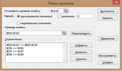 Рис. 3.23. Вид окна Поиск решений с окончательной записью компьютерного аналога математической модели (3.20).
