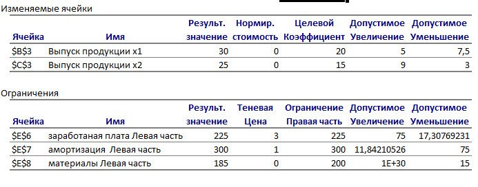 Так же можно сделать данное решение в виде отчета, только в этом случае в окне Результаты поиска решения (см. рис. 3.28) выбираем раздел Устойчивость и получаем документ с отчетом "Отчет по устойчивости 1" (рис. 3.30).