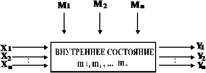 На рис. 2 стрелками указаны направления воздействий, которыми обмениваются части системы. На каждую систему с помощью множества внешних воздействий оказывает влияние окружающая среда. Эти внешние воздействия называют входными величинами (входными переменными системы), а элементы системы, к которым приложены входные воздействия, - входами системы. При решении задач управления выделяют два типа входных величин: управляющие воздействия Х и возмущающие воздействия М. К управляющим воздействиям относятся такие величины, значениями которых можно распоряжаться при управлении системой и можно их изменять с целью осуществления движения в желаемом направлении. Возмущающие воздействия оказывают влияние на движение, и их в процессе управления нельзя изменять, а надо учитывать при выработке управляющих воздействий. Воздействие самой системы на окружающую среду характеризуется значениями ее выходных величин Y. Совокупность выходных величин позволяет субъекту управления соответствие результатов целям управления. Выходные величины, как правило, изменяются с изменением входных величин. На результаты работы системы влияют и возмущения внутреннего характера, возникающие в самой системе. Внутреннее состояние системы можно охарактеризовать совокупностью значений m, определяющих ее поведение (рис. 3).