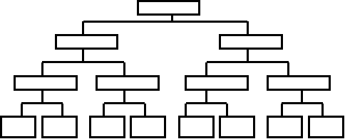 Интервал управления часто определяют как "узкий" или "широкий". Узкий интервал управления характеризуется минимальным количеством подчиненных у одного руководителя и предлагает построение многоуровневой организационной структуры (рис. 15). Такое группирование людей и работ имеет и преимущества, и недостатки. Так, при меньшем количестве подчиненных руководителю легче осуществлять контроль за их работой, и поэтому у него появляется возможность делать это более качественно и быстро. Однако при таком построении связей у руководителя может появиться стремление к вмешательству в их непосредственную работу. Кроме того, многоуровневость делает эти связи громоздкими, длинными и дорогими.