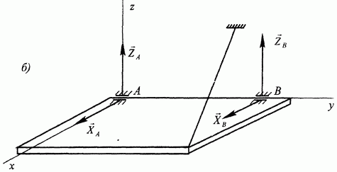 Рис. 14. 7. Цилиндрический шарнир (рис. 15, а), радиальный подшипник (рис. 15, б). Реакция проходит через центр шарнира (центр срединного сечения подшипника) и лежит в плоскости, перпендикулярной оси шарнира (подшипника). Она эквивалентна двум неизвестным по модулю силам - составляющим этой реакции вдоль соответствующих координатных осей (силы