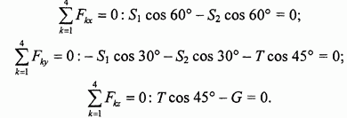 Решая эти уравнения, приходим к тем же значениям для неизвестных сил: Отметим, что реакция N - это сила, с которой стенка действует на шар. Давление шара на стенку суть сила N, приложенная от шара к стенке. Она равна по модулю силе N, но направлена в противоположную сторону - от шара к стенке (показана штрихами на рис. 27, а). Пример 2. Груз весом Мысленно перережем трос и стержни и приложим к точке D реакции Получаем уравновешенную систему из четырех сил, которые образуют пространственную систему сил, сходящихся в точке Геометрическое условие равновесия для пространственной системы сил оказывается малопригодным, так как приводит к построению замкнутого пространственного силового многоугольника. Здесь эффективен аналитический способ решения задач на равновесие. Выбираем наиболее удобную для вычисления проекций сил систему координатных осей (см. рис. 28) и составляем уравнения равновесия;