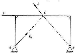 Если свободное твердое тело находится в равновесии под действием трех непараллельных сил, то эти силы лежат в одной плоскости, а линии действия сил пересекаются в одной точке. Эта теорема позволяет в ряде случаев определить направление реакции связи. Пример. Указать направление полной реакции шарнира А трехшарнирной арки ABC (рис. 29). Арка нагружена силой Р, весом полуарок пренебречь. Рассматриваем отдельно каждую полуарку. Полуарка ВС служит для полуарки АС коленчатой стержневой связью (см. рис. 13,6 на стр. 18), поэтому ее реакция Теперь видно, что для полуарки АС выполняются все условия теоремы о трех силах (третьей силой является полная реакция
