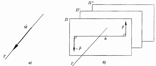 Рис. 34. 3. Пару сил можно перемещать параллельно себе в любую плоскость, неизменно связанную с телом, к которому она приложена. Перечисленные в этих свойствах действия не изменяют ни величину, ни направление момента пары, поэтому являются эквивалентными преобразованиями пары. В приведенных выше примерах речь шла о построении момента по заданным элементам пары - плоскости действия, силам и плечу пары. Можно ставить и обратную задачу - построить пару сил по ее моменту. Пусть требуется построить пару сил по ее моменту М (рис. 35, а). Для этого строим плоскость П, перпендикулярную линии действия
