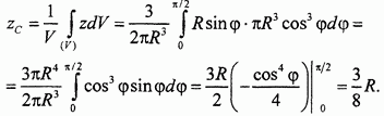 В этих формулах S - площадь поверхности тела, Пример 1. Найти центр тяжести однородного полушара радиуса Выберем начало координат в центре основания полушара, проведем координатные оси (рис. 59). Полушар симметричен относительно оси В качестве элемента интегрирования выбираем в полушаре слой толщиной