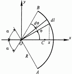 Рис. 59. Примем за элемент интегрирования бесконечно малый участок дуги, определяемый конечным углом