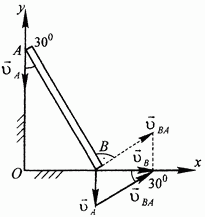Полученная формула выражает метод полюса, служащий наиболее общим методом определения скоростей точек тела при плоскопараллельном движении. Ему соответствует следующая словесная формулировка: скорость произвольной точки плоской фигуры равна геометрической сумме скорости точки, принятой за полюс, и линейной скорости во вращательном движении этой точки вместе с плоской фигурой вокруг полюса. На рис. 100, б приводится геометрическая интерпретация полученного правила. Пример. Вычислить скорость точки В стрежня в примере на с. 97. Движение стержня является плоскопараллельным. Выберем за полюс точку А стержня, тогда для точки В в соответствии с методом полюса можем написать:
