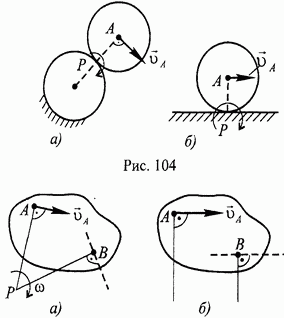 Из предыдущего пункта видно, что вычисление скоростей при плоскопараллельном движении сильно упрощается, если положение мгновенного центра скоростей известно. Общий способ определения его положения рассмотрен выше. Ниже приводятся характерные частные случаи, когда положение мгновенного центра скоростей (сокращенно 1. Одна цилиндрическая поверхность катится без скольжения по другой цилиндрической поверхности (или плоскости), остающейся неподвижной. 2. Известны скорость одной точки тела (по величине и направлению) и направление скорости другой точки (штриховые линии на рис. 105).