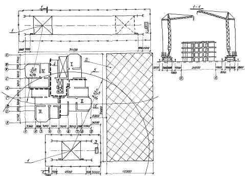 Рис. 1. Схема производства: 1 - кран КБ-40Б.1 (R=25 м, Q=7т); 2 - площадка складирования материалов и укрупнительной сборки полутуннелей; 3 - контрольный груз; 4 - граница эахваток; 5 - радиус действия башенного крана