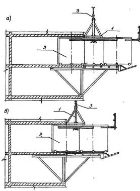 Рис. 2. Схема строповки блока полутуннелей: а) блок полутуннелей, состоящий из трех секций; б) блок полутуннелей состоящий из двух секций; 1 - специальное, транспортное приспособление; 2 - блок полутуннелей; 3 - крюк башенного крана.
