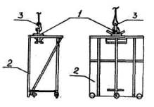 Рис. 3. Схема строповки отдельной полусекции: 1 - специальное транспортное приспособление; 2 - блок полутуннелей; 3 - крюк башенного крана