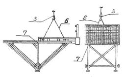Рис. 5. Схема строповки выкатных подмостей: 6 - четырехветвевой строп 4CК (L = 5 м, Q - 5 т); 7 - выкатные подмости