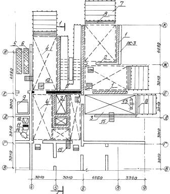 17 - торцевая опалубка стен лестничной клетки и лифтовой шахты; 18 - туннельная опалубка; 19 - приставная лестница; 20 - выкатные подмостки; 21 - временное инвентарное ограждение Примечание. Условные обозначения приведены далее.