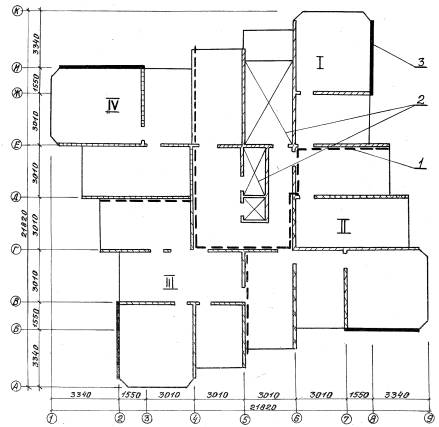 Рис. 1. Схема разбивки типового этажа на захватки Условные обозначения: I…IV - номера захваток; 1 - граница захваток; 2 - подмости лестничной клетки и шахты лифта; 3 - опалубочная стеновая панель.